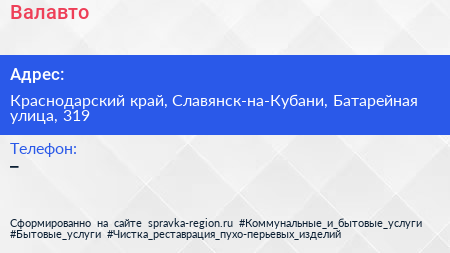 Валавто по адресу Краснодарский край, Славянск-на-Кубани, Батарейная улица, 319 в дальнейшем Организация, размещена в следующих категориях: