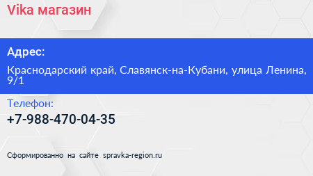 Vika, магазин по адресу Краснодарский край, Славянск-на-Кубани, улица Ленина, 9/1 в дальнейшем Организация, размещена в следующих категориях: