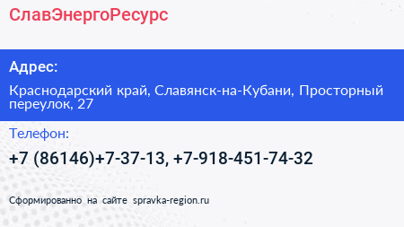 СлавЭнергоРесурс по адресу Краснодарский край, Славянск-на-Кубани, Просторный переулок, 27 в дальнейшем Организация, размещена в следующих категориях: