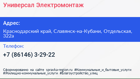 Универсал-Электромонтаж по адресу Краснодарский край, Славянск-на-Кубани, Отдельская, 322а в дальнейшем Организация, размещена в следующих категориях: