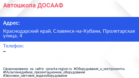 Автошкола ДОСААФ по адресу Краснодарский край, Славянск-на-Кубани, Пролетарская улица, 4 в дальнейшем Организация, размещена в следующих категориях: