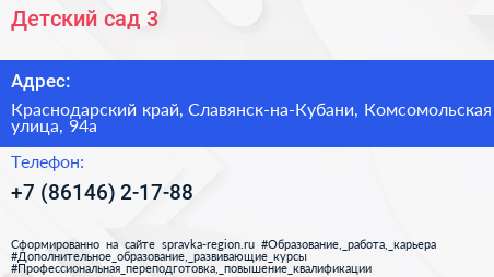 Детский сад №3 по адресу Краснодарский край, Славянск-на-Кубани, Комсомольская улица, 94а в дальнейшем Организация, размещена в следующих категориях: