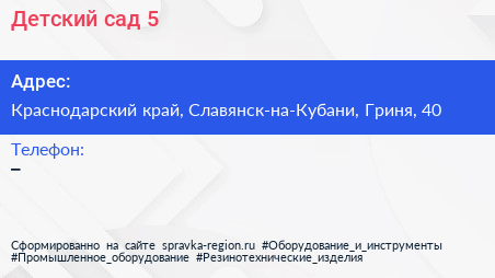 Детский сад №5 по адресу Краснодарский край, Славянск-на-Кубани, Гриня, 40 в дальнейшем Организация, размещена в следующих категориях: