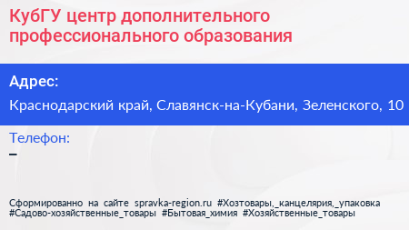 КубГУ, центр дополнительного профессионального образования по адресу Краснодарский край, Славянск-на-Кубани, Зеленского, 10 в дальнейшем Организация, размещена в следующих категориях:
