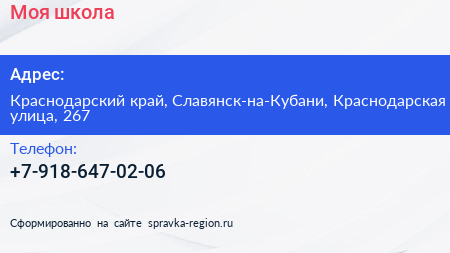 Моя школа по адресу Краснодарский край, Славянск-на-Кубани, Краснодарская улица, 267 в дальнейшем Организация, размещена в следующих категориях:
