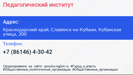 Педагогический институт по адресу Краснодарский край, Славянск-на-Кубани, Кубанская улица, 200 в дальнейшем Организация, размещена в следующих категориях: