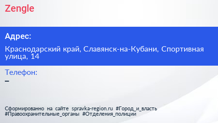 Zengle по адресу Краснодарский край, Славянск-на-Кубани, Спортивная улица, 14 в дальнейшем Организация, размещена в следующих категориях: