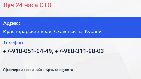 Луч 24 часа, СТО по адресу Краснодарский край, Славянск-на-Кубани, в дальнейшем Организация, размещена в следующих категориях: