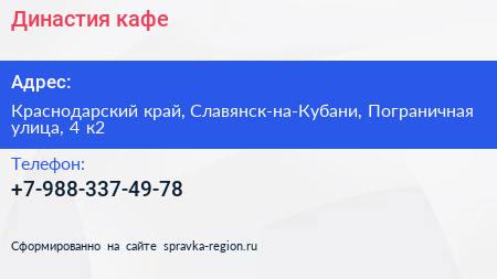 Династия, кафе по адресу Краснодарский край, Славянск-на-Кубани, Пограничная улица, 4 к2 в дальнейшем Организация, размещена в следующих категориях: