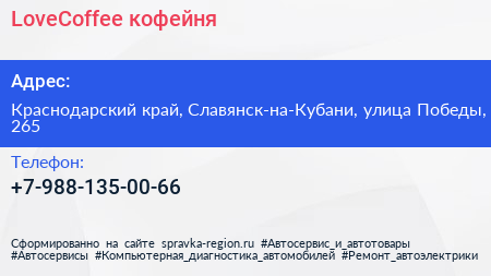 LoveCoffee, кофейня по адресу Краснодарский край, Славянск-на-Кубани, улица Победы, 265 в дальнейшем Организация, размещена в следующих категориях: