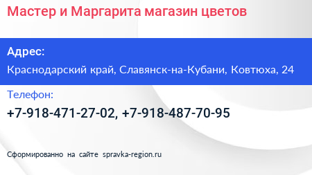 Мастер и Маргарита, магазин цветов по адресу Краснодарский край, Славянск-на-Кубани, Ковтюха, 24 в дальнейшем Организация, размещена в следующих категориях: