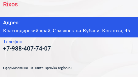 Rixos по адресу Краснодарский край, Славянск-на-Кубани, Ковтюха, 45 в дальнейшем Организация, размещена в следующих категориях: