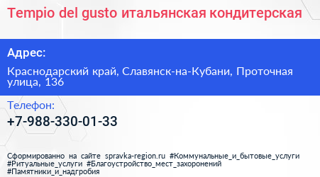 Tempio del gusto, итальянская кондитерская по адресу Краснодарский край, Славянск-на-Кубани, Проточная улица, 136 в дальнейшем Организация, размещена в следующих категориях: