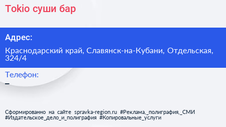 Tokio, суши-бар по адресу Краснодарский край, Славянск-на-Кубани, Отдельская, 324/4 в дальнейшем Организация, размещена в следующих категориях: