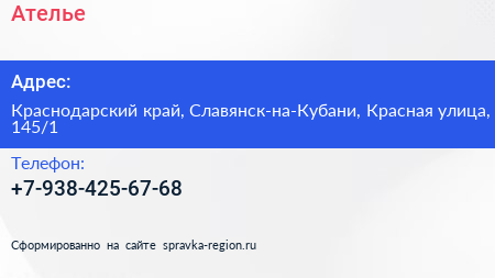 Ателье по адресу Краснодарский край, Славянск-на-Кубани, Красная улица, 145/1 в дальнейшем Организация, размещена в следующих категориях: