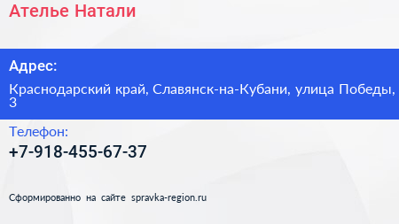 Ателье Натали по адресу Краснодарский край, Славянск-на-Кубани, улица Победы, 3 в дальнейшем Организация, размещена в следующих категориях: