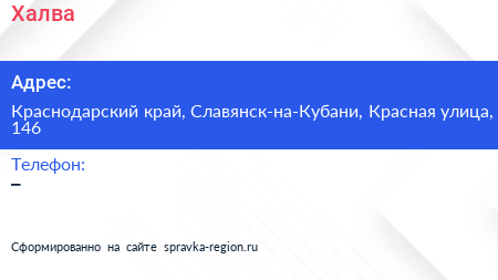 Халва по адресу Краснодарский край, Славянск-на-Кубани, Красная улица, 146 в дальнейшем Организация, размещена в следующих категориях: