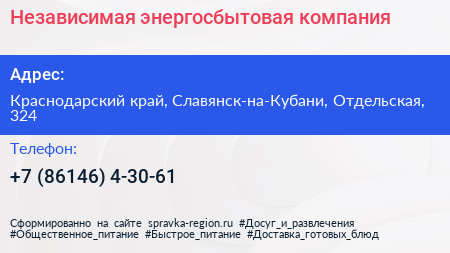 Независимая энергосбытовая компания по адресу Краснодарский край, Славянск-на-Кубани, Отдельская, 324 в дальнейшем Организация, размещена в следующих категориях: