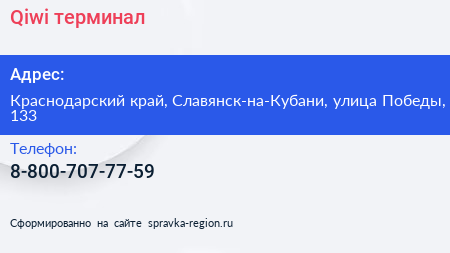 Qiwi, терминал по адресу Краснодарский край, Славянск-на-Кубани, улица Победы, 133 в дальнейшем Организация, размещена в следующих категориях: