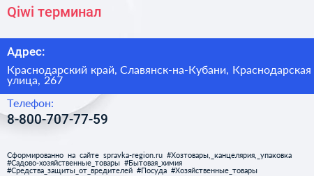 Qiwi, терминал по адресу Краснодарский край, Славянск-на-Кубани, Краснодарская улица, 267 в дальнейшем Организация, размещена в следующих категориях: