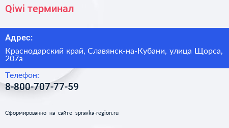 Qiwi, терминал по адресу Краснодарский край, Славянск-на-Кубани, улица Щорса, 207а в дальнейшем Организация, размещена в следующих категориях: