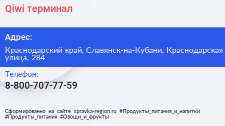 Qiwi, терминал по адресу Краснодарский край, Славянск-на-Кубани, Краснодарская улица, 284 в дальнейшем Организация, размещена в следующих категориях:
