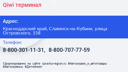 Qiwi, терминал по адресу Краснодарский край, Славянск-на-Кубани, улица Островского, 158 в дальнейшем Организация, размещена в следующих категориях: