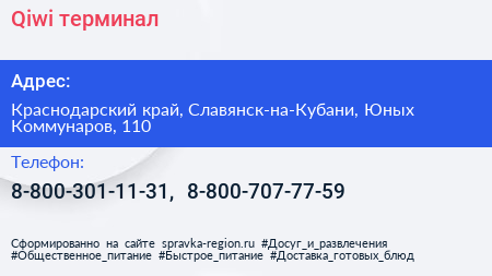 Qiwi, терминал по адресу Краснодарский край, Славянск-на-Кубани, Юных Коммунаров, 110 в дальнейшем Организация, размещена в следующих категориях: