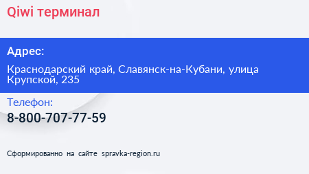 Qiwi, терминал по адресу Краснодарский край, Славянск-на-Кубани, улица Крупской, 235 в дальнейшем Организация, размещена в следующих категориях: