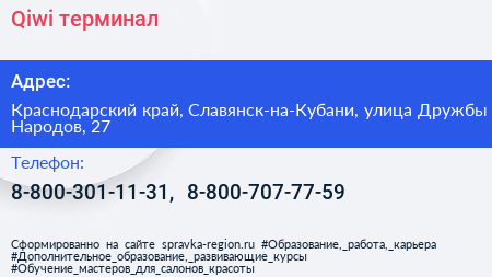 Qiwi, терминал по адресу Краснодарский край, Славянск-на-Кубани, улица Дружбы Народов, 27 в дальнейшем Организация, размещена в следующих категориях: