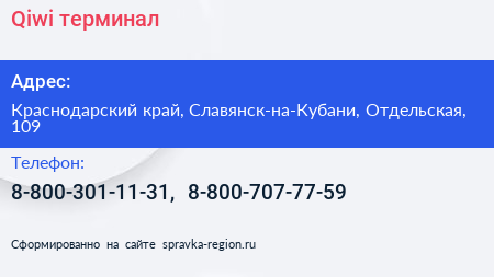 Qiwi, терминал по адресу Краснодарский край, Славянск-на-Кубани, Отдельская, 109 в дальнейшем Организация, размещена в следующих категориях:
