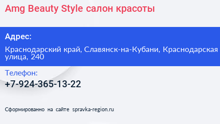 Amg Beauty Style, салон красоты по адресу Краснодарский край, Славянск-на-Кубани, Краснодарская улица, 240 в дальнейшем Организация, размещена в следующих категориях: