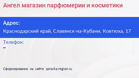 Ангел, магазин парфюмерии и косметики по адресу Краснодарский край, Славянск-на-Кубани, Ковтюха, 17 в дальнейшем Организация, размещена в следующих категориях: