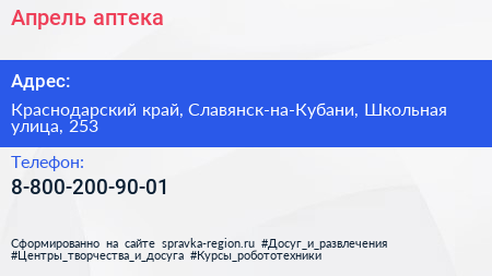 Апрель, аптека по адресу Краснодарский край, Славянск-на-Кубани, Школьная улица, 253 в дальнейшем Организация, размещена в следующих категориях: