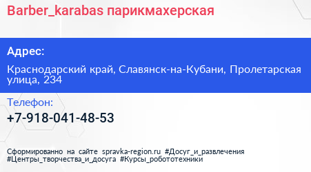 Barber_karabas, парикмахерская по адресу Краснодарский край, Славянск-на-Кубани, Пролетарская улица, 234 в дальнейшем Организация, размещена в следующих категориях: