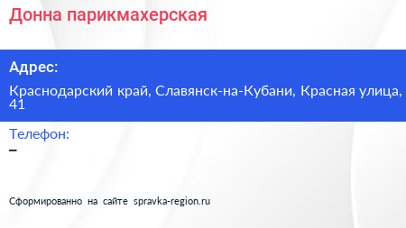 Донна, парикмахерская по адресу Краснодарский край, Славянск-на-Кубани, Красная улица, 41 в дальнейшем Организация, размещена в следующих категориях: