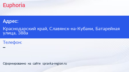 Euphoria по адресу Краснодарский край, Славянск-на-Кубани, Батарейная улица, 388а в дальнейшем Организация, размещена в следующих категориях:
