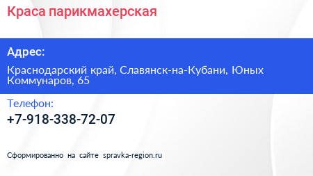 Краса, парикмахерская по адресу Краснодарский край, Славянск-на-Кубани, Юных Коммунаров, 65 в дальнейшем Организация, размещена в следующих категориях: