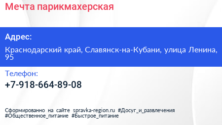 Мечта, парикмахерская по адресу Краснодарский край, Славянск-на-Кубани, улица Ленина, 95 в дальнейшем Организация, размещена в следующих категориях: