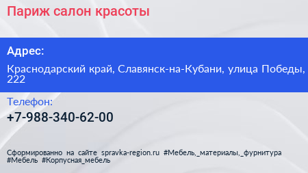 Париж, салон красоты по адресу Краснодарский край, Славянск-на-Кубани, улица Победы, 222 в дальнейшем Организация, размещена в следующих категориях: