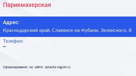 Парикмахерская по адресу Краснодарский край, Славянск-на-Кубани, Зеленского, 8 в дальнейшем Организация, размещена в следующих категориях: