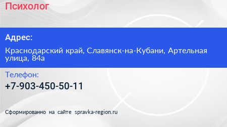 Психолог по адресу Краснодарский край, Славянск-на-Кубани, Артельная улица, 84а в дальнейшем Организация, размещена в следующих категориях: