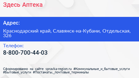 Здесь Аптека по адресу Краснодарский край, Славянск-на-Кубани, Отдельская, 326 в дальнейшем Организация, размещена в следующих категориях: