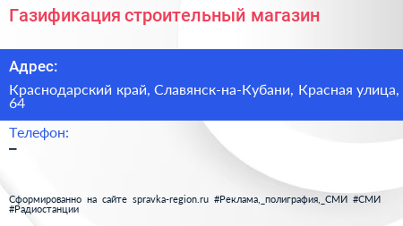 Газификация, строительный магазин по адресу Краснодарский край, Славянск-на-Кубани, Красная улица, 64 в дальнейшем Организация, размещена в следующих категориях: