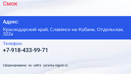 Смок по адресу Краснодарский край, Славянск-на-Кубани, Отдельская, 322а в дальнейшем Организация, размещена в следующих категориях: