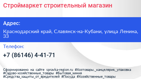 Строймаркет, строительный магазин по адресу Краснодарский край, Славянск-на-Кубани, улица Ленина, 33 в дальнейшем Организация, размещена в следующих категориях: