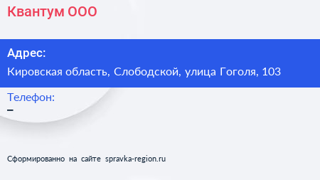 Квантум, ООО по адресу Кировская область, Слободской, улица Гоголя, 103 в дальнейшем Организация, размещена в следующих категориях: