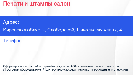 Печати и штампы, салон по адресу Кировская область, Слободской, Никольская улица, 4 в дальнейшем Организация, размещена в следующих категориях: