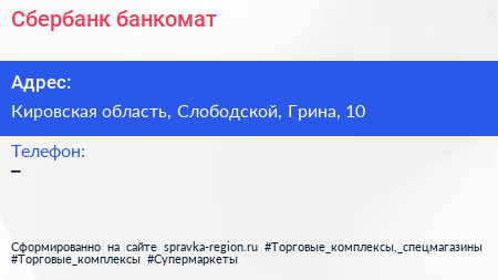 Сбербанк, банкомат по адресу Кировская область, Слободской, Грина, 10 в дальнейшем Организация, размещена в следующих категориях: