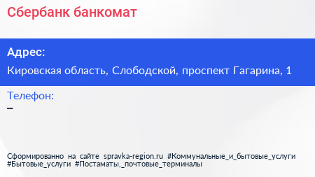 Сбербанк, банкомат по адресу Кировская область, Слободской, проспект Гагарина, 1 в дальнейшем Организация, размещена в следующих категориях: